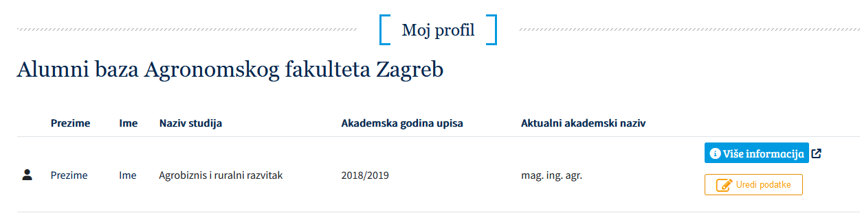 Na stranici Moj profil zapis je moguće pregledati (gumb Više informacija) ili urediti (gumb Uredi podatke). Gumb Uredi podatke otvara obrazac za uređivanje podataka.