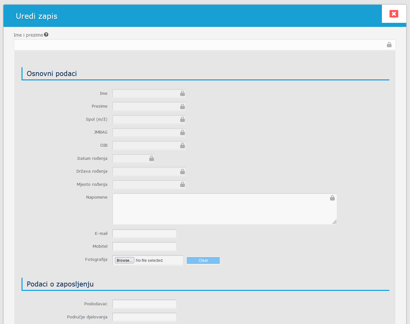 Obrazac omogućuje uređivanje podataka koji nisu zaključani (ikona lokota). Sve ostale podatke može uređivati samo administrator. Na kraju uređivanja podataka potrebo je kliknuti na gumb Spremi promjene.